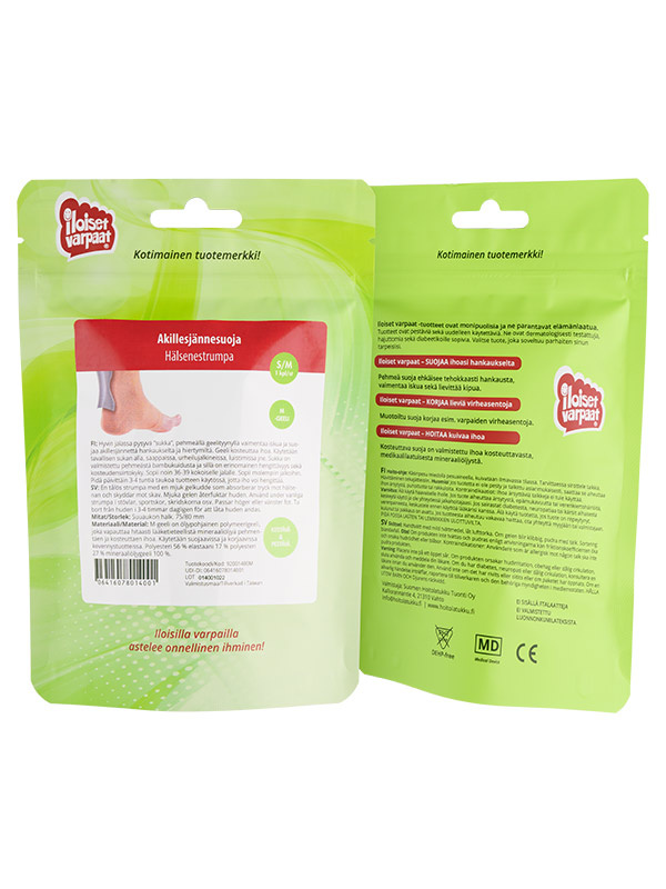 Iloiset Varpaat -akillesjännesuoja on pehmeä ja hyvin jalassa pysyvä ”sukka”, jossa on suojaava geelityyny. Se vaimentaa iskua ja suojaa akillesjännettä hankauksilta ja hiertymiltä. Geelityyny kosteuttaa ihoa ja lisää käyttömukavuutta. Suojan päälliosa on valmistettu hengittävästä bambukuidusta, joka siirtää tehokkaasti kosteutta ja pitää jalat kuivina. Sopii käytettäväksi tavallisten sukkien alla, saappaissa, urheilukengissä ja luistimissa. Sopii molempiin jalkoihin ja noin kokoihin 36–39.