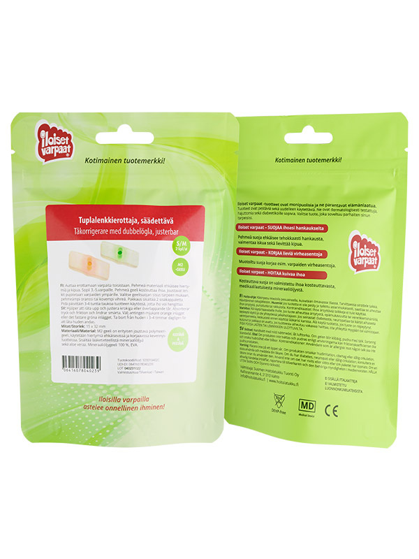Säädettävä tuplalenkkierottaja auttaa erottamaan varpaita toisistaan ja ehkäisee tehokkaasti hiertymiä sekä kipua. Pehmeä ja joustava geelimateriaali kosteuttaa ihoa ja tekee käytöstä miellyttävää. Soveltuu erityisesti 3.–5. varpaiden erottamiseen. Joustavat lenkit pujotetaan varpaiden ympärille pitämään erottaja paikoillaan. Geeliosan jäykkyyttä voidaan säätää mukana tulevien sisäkappaleiden avulla: valitse pehmeämpi oranssi tai tukevampi vihreä vaihtoehto tarpeen mukaan. Tuote pysyy hyvin paikallaan ja sopii aktiiviseenkin käyttöön.