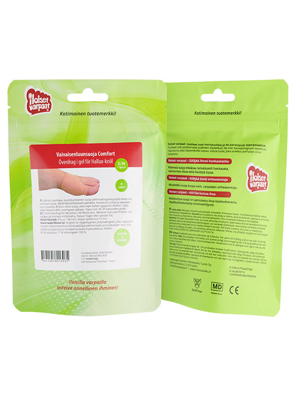 Vaivaisenluunsuoja Comfort tarjoaa huomaamattoman mutta tehokkaan helpotuksen vaivaisenluun aiheuttamiin kipuihin ja hiertymiin. Jalkaan puettava, joustavasta kankaasta valmistettu suoja sisältää pehmeän geelityynyn, joka vähentää painetta ja hankausta vaivaisenluun alueella. Suoja on erittäin ohut, joten se sopii kaikkiin kenkiin – myös juhlakäyttöön. Sopii sekä oikeaan että vasempaan jalkaan, noin 36–39 kokoiselle jalalle.