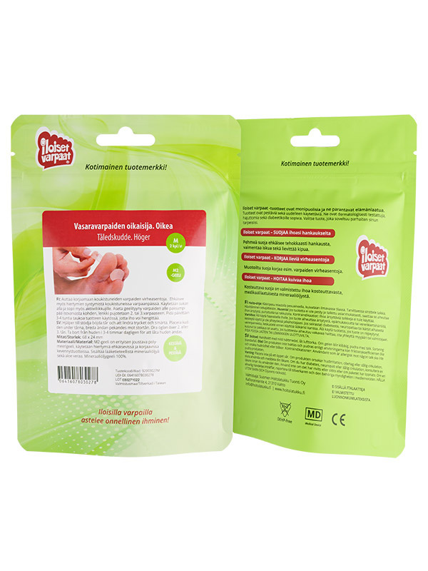 Pakkaus sisältää 2 kpl oikaisijoita oikean jalan varpaille.